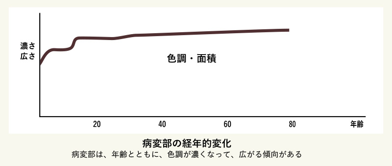 成人になるにしたがい、色調と範囲が広がる傾向にあります。成人の場合は小児に比べて治療回数が多くなる傾向にあり、色素沈着、色素脱失(白抜け)などの合併症のリスクが高くなります。